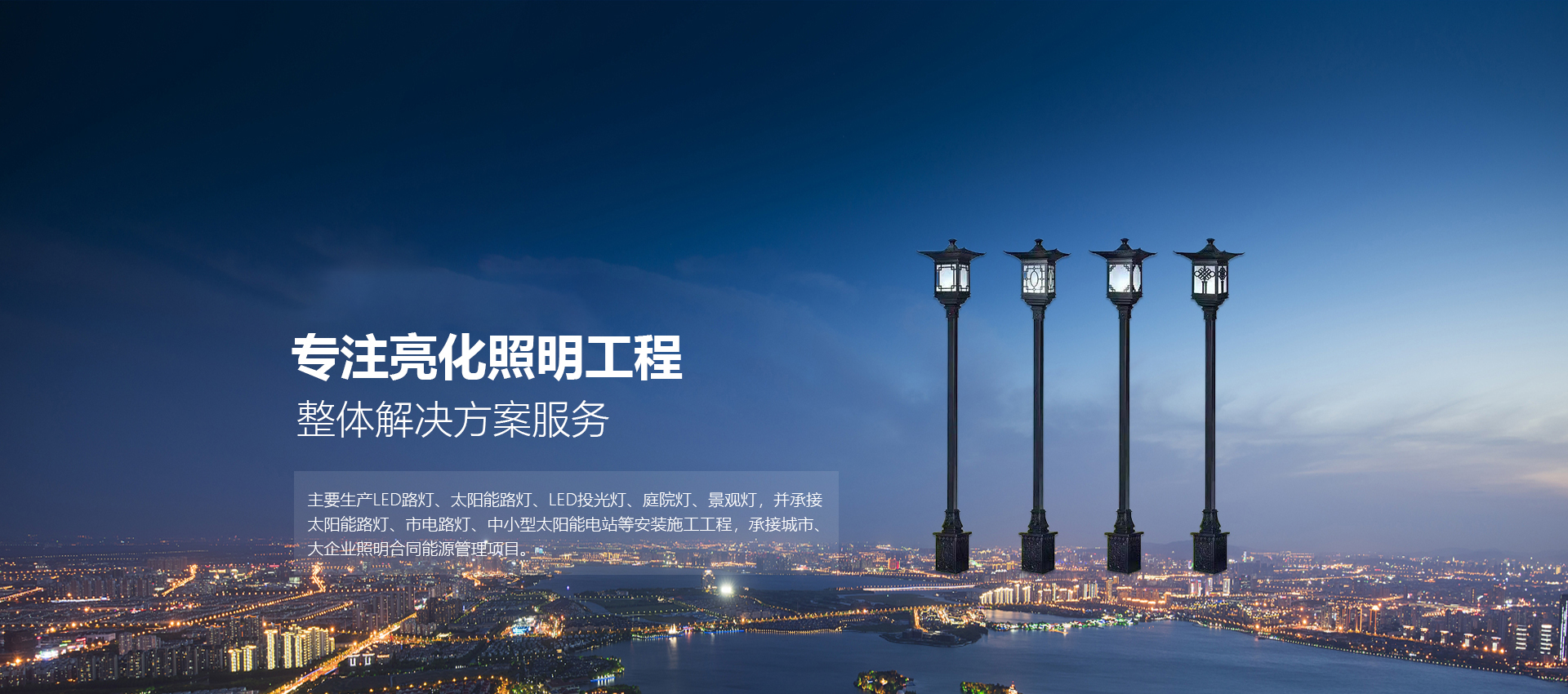 我們的優勢 advantage 主要生產LED路燈、LED太陽能路燈、LED投光燈、庭院燈、景觀燈,并承接太陽能路燈、市政路燈、市電路燈、中小型太陽能電站等安裝施工工程,承接城市、大企業照明合同能源管理項目。